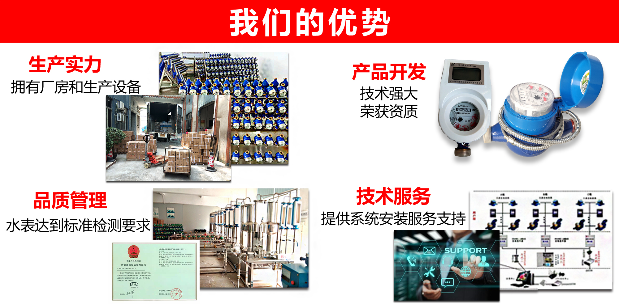 本公司是一家擁有456.jpg商標(biāo)、廣東省一家擁有五羊水表合法資質(zhì)的水表廠家。通過ISO- 2016認(rèn)證,擁有多項(xiàng)自主品牌的知識產(chǎn)權(quán),對智能卡表和光電直讀遠(yuǎn)傳表提供多種技術(shù)解決方案。